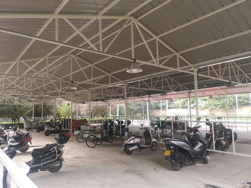 此次車棚的搭建前期經(jīng)過了認(rèn)真的考察選址,車棚整體由子公司陜西建設(shè)鋼構(gòu)有限公司承建,建成后寬敞明亮,美觀大方,最多可同時供74臺電動車同時充電。車棚采用了現(xiàn)代化的設(shè)計理念,比如新增智能化充電設(shè)備,在電動車充電過程中,智能充電設(shè)備可自動監(jiān)控單次充電時長及檢測電池電量,電池電量充滿會自行斷電,不僅可有效延長電動車電池的使用壽命,也可消除因過度充電帶來的電池爆炸、起火隱患,并且免費(fèi)供職工使用。搭建的雨棚采用山形設(shè)計,美觀時尚,車棚新建消防通道2條,并配齊消防器材,為職工創(chuàng)造了更加安全便捷舒適的充電環(huán)境。